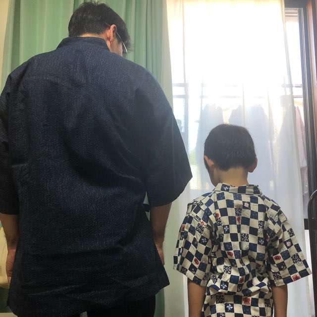 昨日は着付けのお勉強会もあって、出る前に家族で浴衣と甚平を着ました。